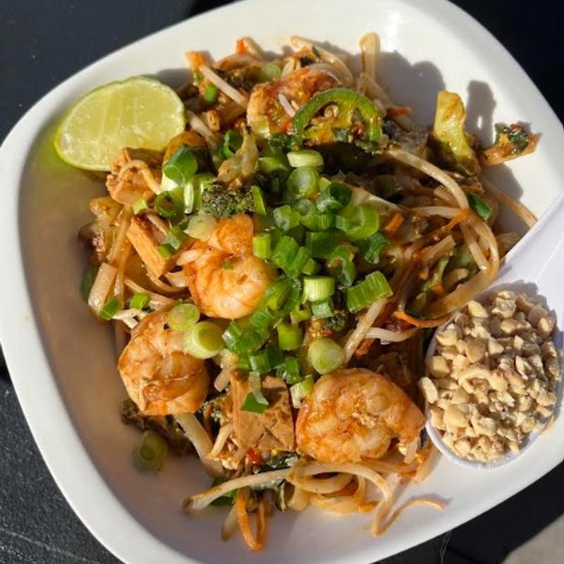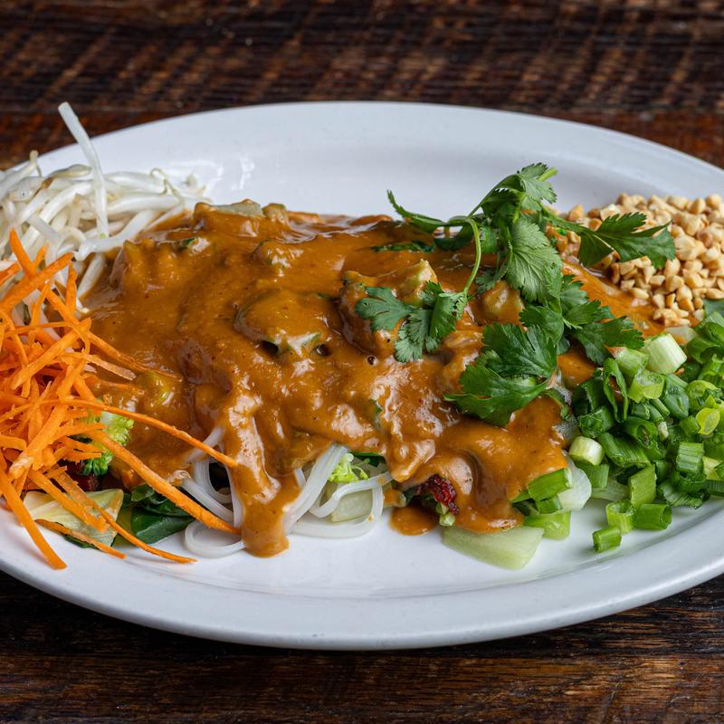 Rice noodles, mixed vegetables, house-made Thai peanut sauce, peanuts, cilantro, bean sprouts, carrots, scallions, and lime.