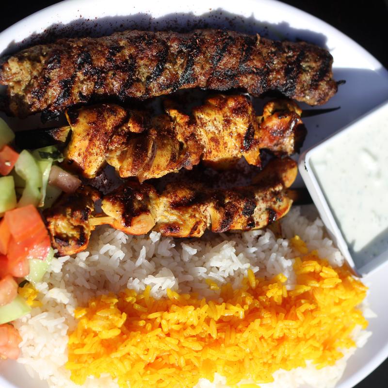 Free-range chicken marinated in saffron, lemon juice, and olive oil. Grilled and served with basmati rice and cucumber-tomato salad.