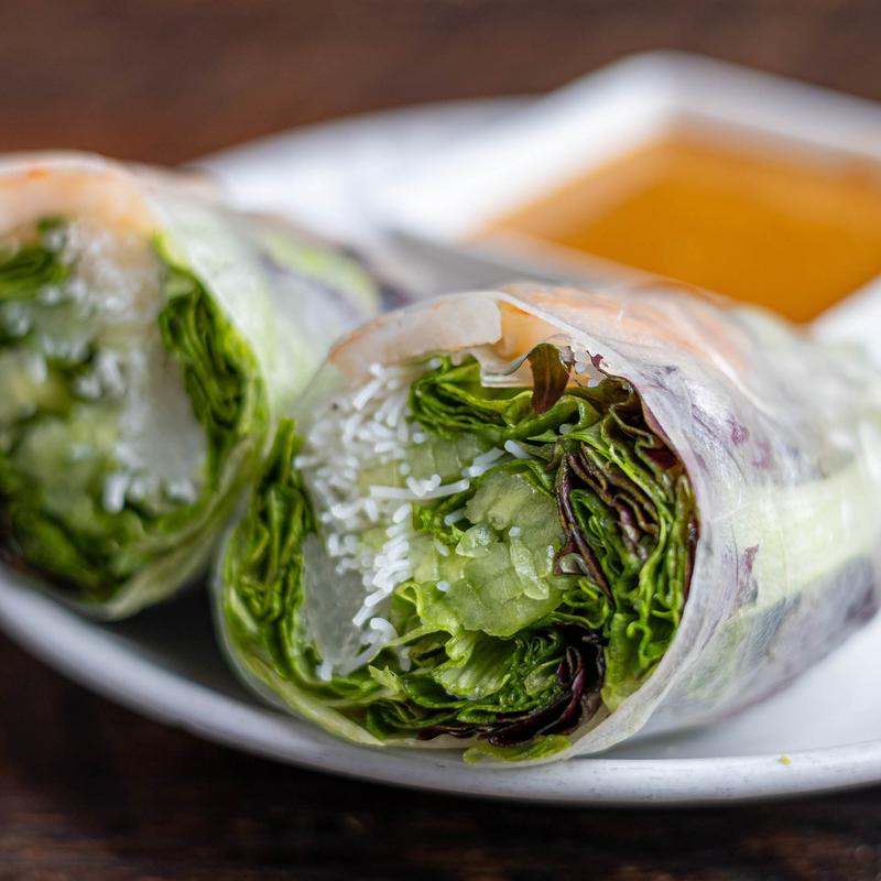 Rice paper roll with tiger prawns, rice noodles, spring mix, cucumbers, and peanut sauce.
