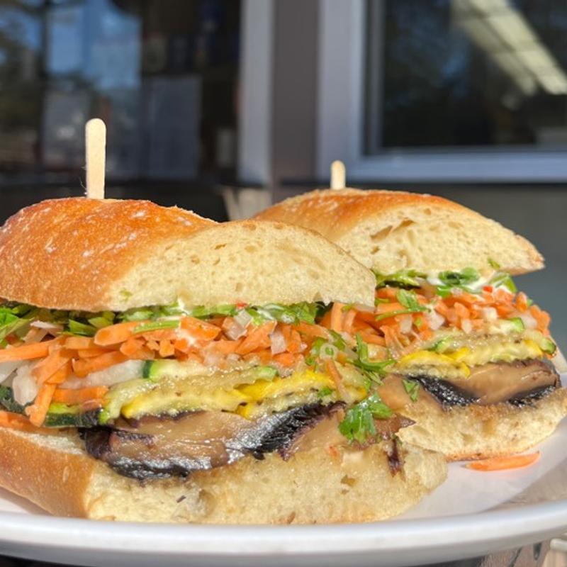 Bahn Mi with portobello mushroom and grilled squash served on our popular baguette with Aioli and Jalapenos | For Vegan ask for no aioli