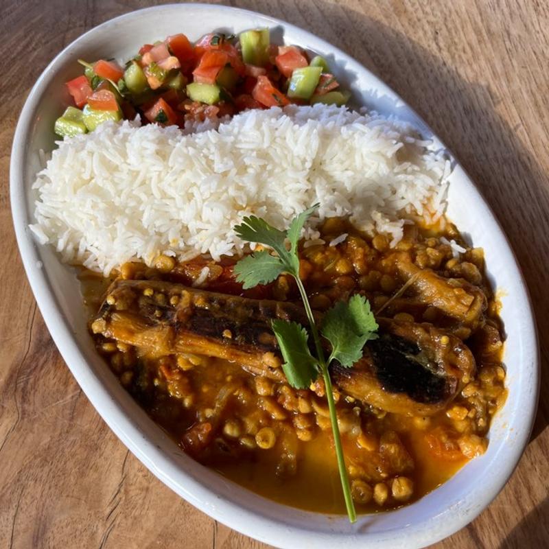 South Asian dish with eggplant, split peas, and tomatoes slow-cooked with turmeric, lime, onions, and saffron. Served with rice and a side of tomato cucumber salad.