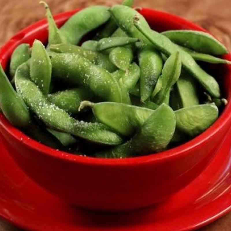 Young green soybeans steamed in their pods. A healthy plant-based protein rich in vitamins, dietary fiber, and isoflavones is associated with a reduced risk of breast cancer recurrence.