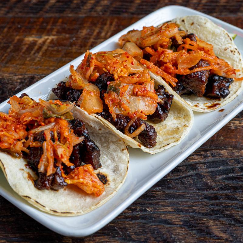 Three soft corn tortillas topped with chopped marinated organic beef ribeye and artisan-made organic Napa Cabbage Kimchi. Sweet, savory, tangy, and loaded with healthy probiotics for digestion, these flavors. Gluten Free, organic, and made with marin-based small manu