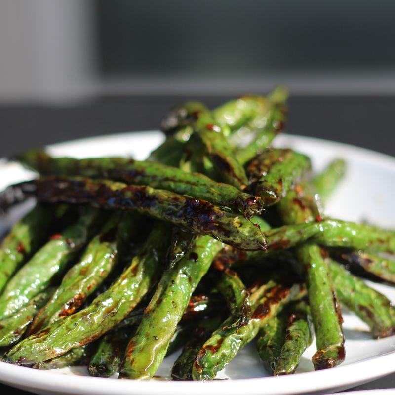 Shishito peppers sauteed with garlic, sesame, and soy sauce. Some are very hot!